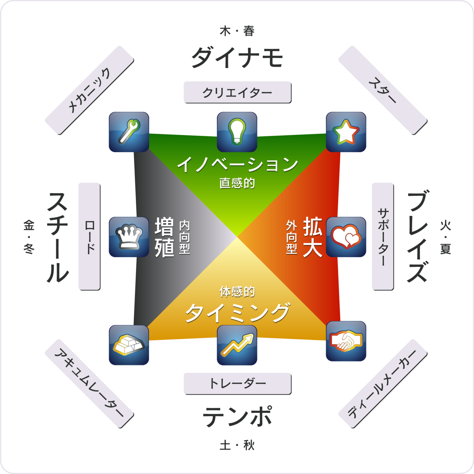 ダイナモ(創造)→ ブレイズ(拡散)→ テンポ(安定)→ スチール(構造化)