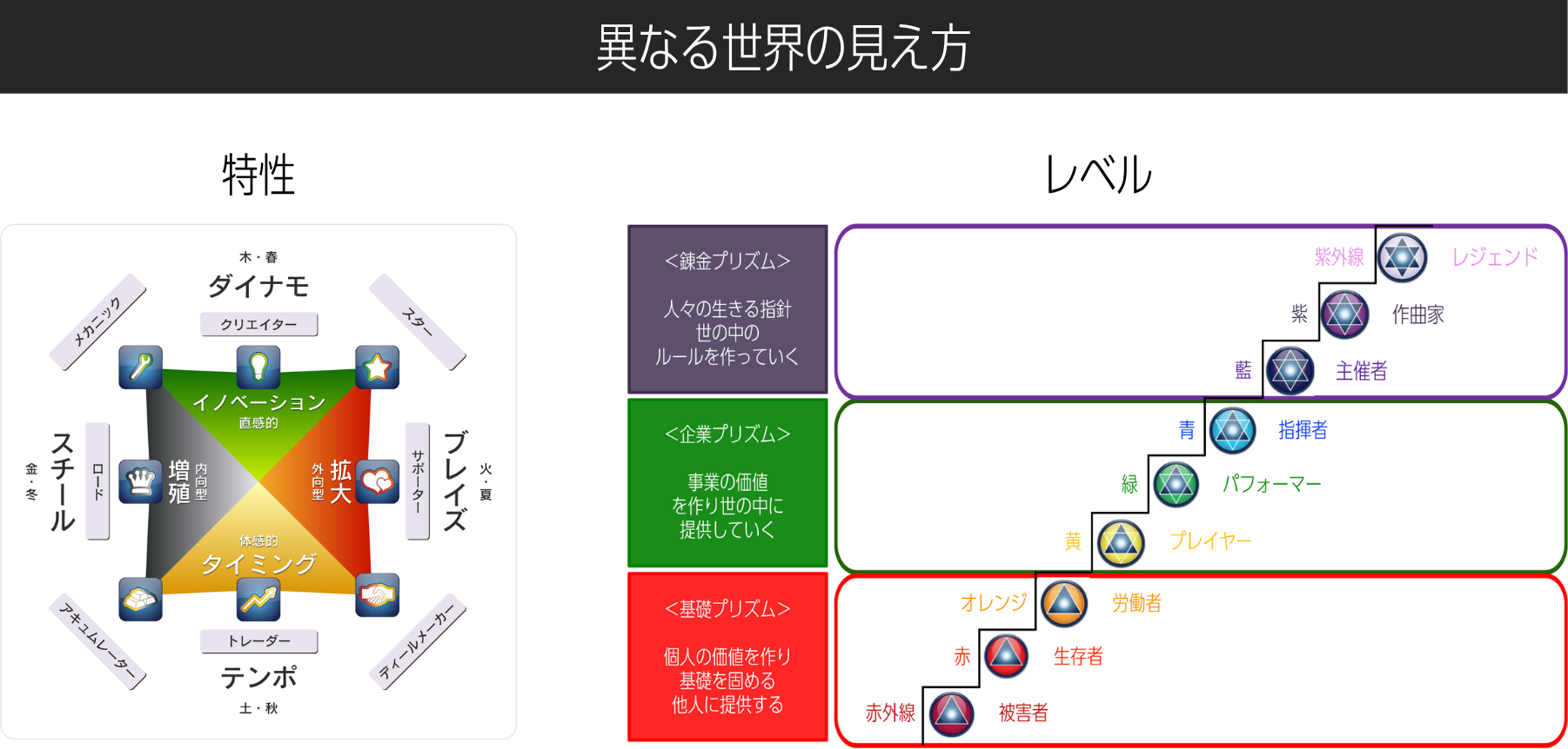 ウェルスダイナミクスでは、特性に加えて「今どの段階(レベル)にいるのか」という視点も重視します。これをスペクトルと呼びます。